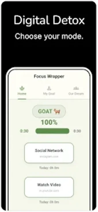 En unik funktion är det visuella fokus-systemet, som ändrar bakgrundsfärgen från grönt till grått beroende på användning av distraherande webbplatser. Dessutom inkluderar appen en ”GOAT Mode Challenge” för att uppmuntra användare att sätta strikta tidsgränser, och dagliga ritualer för att hjälpa till med målsättning och rutiner. Focus Wrapper strävar efter att ge en ren och etisk surfupplevelse utan annonser, vilket gör det möjligt för användare att återta kontrollen över sin digitala hälsa.
